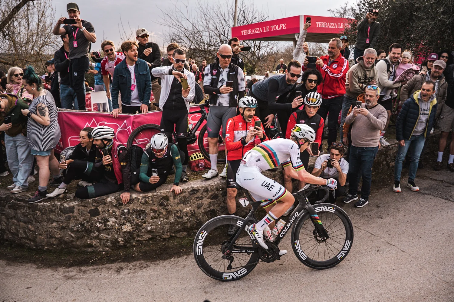 Experience the tactical brilliance of both the Women’s and Men’s elite races as they tackle the Tolfe climb twice. You are perfectly positioned to see the riders' faces as they dig in for the decisive push toward Siena.